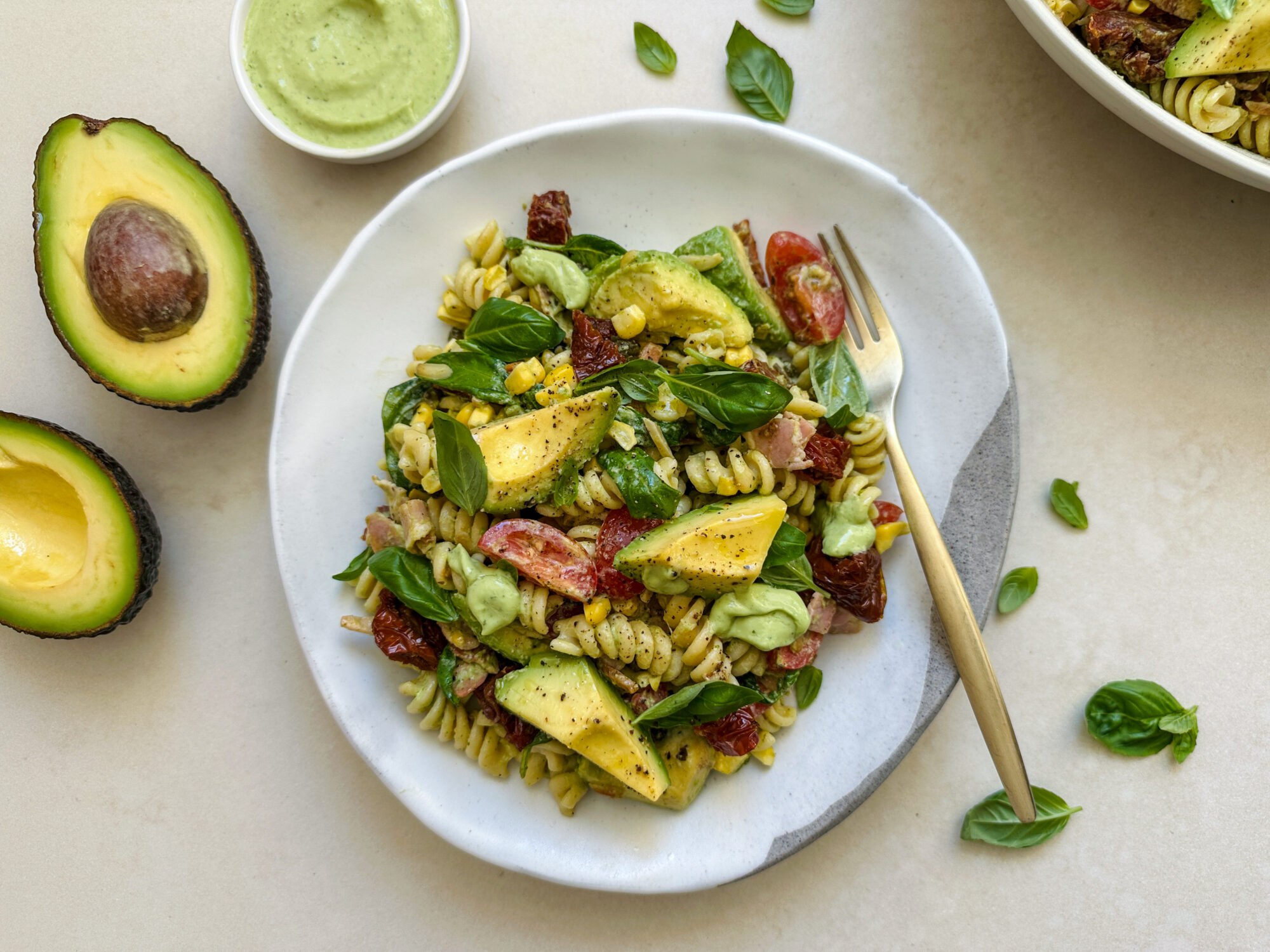 Roughly chop the remaining parsley and combine in a large mixing bowl with the cooked pasta, corn, tomatoes, bacon/capers, and avocado sauce and olive oil. Toss gently to combine and seasoning to taste.